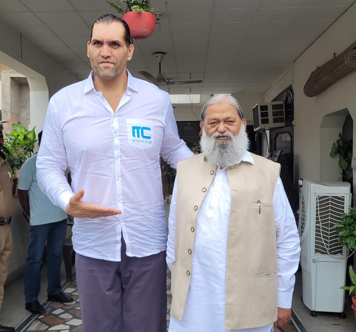 अंबाला: हरियाणा के ऊर्जा, परिवहन एवं श्रम मंत्री अनिल विज से आज उनके आवास पर WWE के पूर्व रेस्लर द ग्रेट खली ने मुलाकात की। मंत्री अनिल विज ने खली का अपने आवास पर स्वागत करते हुए उनसे चर्चा। कैबिनेट मंत्री अनिल विज को अपना बड़ा भाई एवं आदर्श मानने वाले खली ने कहा कि वह जब भी मंत्री अनिल विज से मिलते है तो उनमें और ऊर्जा का संचार हो जाता है। वह उनके कार्य करने की शैली से बेहद प्रभावित है। उन्होंने कहा मंत्री अनिल विज जनसमर्पित नेता है जोकि सदैव जनता के दिलों में रहते हैं। आज उनसे मुलाकात करने का अवसर मिला जिससे वह स्वयं को सौभाग्यशाली मानते हैं। मुलाकात के दौरान मंत्री अनिल विज से खली ने चर्चा की और उनका हालचाल जाना।