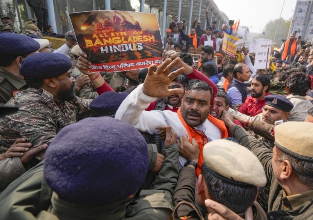 कोलकाता: बांग्लादेश में अल्पसंख्यक हिंदुओं पर कथित हिंसा के खिलाफ नारे लगाते और भगवा झंडे थामे सैकड़ों प्रदर्शनकारियों ने मंगलवार को यहां बांग्लादेश के उप उच्चायोग की ओर मार्च करने की कोशिश की, लेकिन पुलिस ने उन्हें रोक दिया। ‘हिंदू हुंकार पदयात्रा’ शीर्षक से विरोध मार्च का आयोजन ‘बोंगियो हिंदू जागरण’ के बैनर तले किया गया। यह मार्च सियालदह से शुरू हुआ और बांग्लादेश उप उच्चायोग कार्यालय की ओर बढ़ रहा था, तभी बेकबागन इलाके में पुलिस ने इसे रोक दिया। यहां बांग्लादेश के उप उच्चायोग कार्यालय के पास भारी पुलिस बल तैनात किया गया है। प्रदर्शनकारियों ने ‘हिंदू हिंदू, भाई भाई’, ‘बांग्लादेश में हिंदुओं की सुरक्षा’ के नारे लगाए। बांग्लादेश में 18 दिसंबर को कपड़े की एक फैक्ट्री में काम करने वाले 25 वर्षीय दीपू चंद्र दास को मैमनसिंह के बालुका में ईशनिंदा के आरोप में भीड़ ने पीट-पीटकर मार डाला और उसके शव को आग लगा दी। प्रदर्शनकारियों ने दास की मौत के लिए जिम्मेदार लोगों के खिलाफ कार्रवाई और बांग्लादेश में हिंदुओं की सुरक्षा की मांग की।