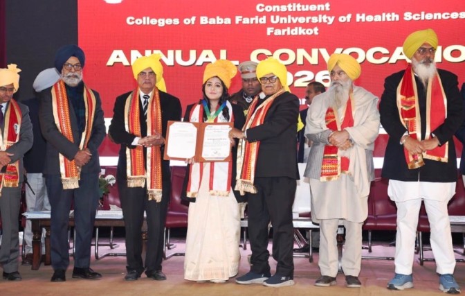 फरीदकोट: बाबा फरीद यूनिवर्सिटी ऑफ हेल्थ साइंसेज (BFUHS), फरीदकोट के कांस्टीट्यूएंट कॉलेजों का सालाना कॉन्वोकेशन आज गुरु गोबिंद सिंह मेडिकल कॉलेज के ऑडिटोरियम में पूरे एकेडमिक धूमधाम से हुआ। इस फंक्शन में पंजाब के गवर्नर और यूनिवर्सिटी के चांसलर, गुलाब चंद कटारिया चीफ गेस्ट के तौर पर शामिल हुए। इस दौरान 139 स्टूडेंट्स को डिग्री दी गईं, जबकि 10 स्टूडेंट्स को गोल्ड और 11 को सिल्वर मेडल से सम्मानित किया गया।