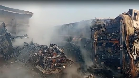गुरुग्राम: हरियाणा के नूंह जिले में कुंडली-मानेसर-पलवल (केएमपी) एक्सप्रेसवे पर रविवार की सुबह घने कोहरे की वजह से कई वाहन आपस में टकरा गए और उनमें आग लग गई, जिसमें एक ट्रक चालक सहित दो लोगों की झुलसकर मौत हो गई। पुलिस ने यह जानकारी दी। पुलिस ने बताया कि सुबह करीब 7:30 बजे हुई इस दुर्घटना के कारण लंबा ट्रैफिक जाम लग गया और एक्सप्रेसवे पर यातायात बुरी तरह बाधित हो गया। पुलिस ने बताया कि सबरस और गुढ़ी गांवों के बीच हुए हादसे के बाद लगी आग को बुझाने के लिए दमकल की तीन गाड़ियों को मौके पर भेजा गया और करीब दो घंटे की मशक्कत के बाद आग पर काबू पाया गया। उसने बताया कि अवरोधक हटाने और यातायात बहाल करने में कुल चार घंटे लगे।