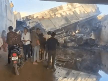 नूंह: हरियाणा में आज सुबह एक दर्दनाक सड़क हादसा होने की खबर सामने आ रही है। सूबे के नूंह जिले में आज यानी शुक्रवार को सुबह दिल्ली मुंबई एक्सप्रेसवे पर भीषण सड़क हादसा हो गया। यहां एक तेज रफ्तार डंपर पुल की दीवार को तोड़ता हुआ करीब 20 फुट नीचे नाले में जा गिरा। नीचे गिरते ही उसमें आग लग गई। डंपर को नीचे गिरता देख आसपास के लोग मौके पर पहुंचे और बचाव कार्य शुरू किया। मगर, डंपर में सवार ड्राइवर और हेल्पर अंदर ही फंस गए। जब तक आग पर काबू पाया जाता, जब तक दोनों की जिंदा जलकर मौत हो गई। सूचना पर पहुंची पुलिस ने दोनों के शवों को किसी तरह डंपर से निकाल कर कब्जे में लिया। प्रत्यक्षदर्शियों के मुताबिक, ड्राइवर-हेल्पर के शरीर पूरी तरह जल चुके थे। हेल्पर का शरीर को कंकाल की तरह नजर आ रहा था। उधर, मृतक ड्राइवर की पहचान रंजीत निवासी जिला अलवर और परवेज निवासी जिला भरतपुर, राजस्थान के रूप में हुई है। फिलहाल, दोनों के शवों को अल आफिया अस्पताल मांडीखेड़ा भिजवा दिया है। डंपर के मालिक से भी संपर्क करने का प्रयास किया जा रहा है।