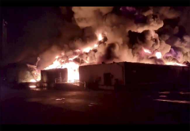 ठाणे : महाराष्ट्र के ठाणे जिले के एक गांव में रविवार रात लगी आग में कम से कम 15 गोदाम जलकर खाक हो गए। इनमें से कुछ गोदाम में पेट्रोलियम उत्पाद भी रखे हुए थे। यहां एक अधिकारी ने यह जानकारी दी। भिवंडी निजामपुर नगर निगम (बीएनएमसी) के अग्निशमन अधिकारी महेश पाटिल ने बताया कि भिवंडी के वाडपे गांव में रात करीब तीन बजे लगी आग में किसी के हताहत होने की खबर नहीं है। उन्होंने बताया कि दमकल के तीन वाहनों को मौके पर भेजा गया और उन्होंने सुबह नौ बजे तक आग पर काबू पा लिया। पाटिल ने बताया कि आग एक गोदाम में लगी थी जो अन्य गोदामों में भी फैल गई। अधिकारी ने बताया कि गोदामों में पेट्रोलियम और स्वास्थ्य संबंधी उत्पाद, ‘कास्मेटिक’ और कपड़े सहित अन्य सामान रखा हुआ था। यहां एक अन्य अधिकारी ने बताया कि आग की लपटें दूर से देखी जा सकती थीं और पेट्रोलियम उत्पादों के जलने के कारण दुर्गंध आ रही थी। सूत्रों के अनुसार वहां रखे पेट्रोलियम उत्पादों के कारण स्थिति और बिगड़ गई।